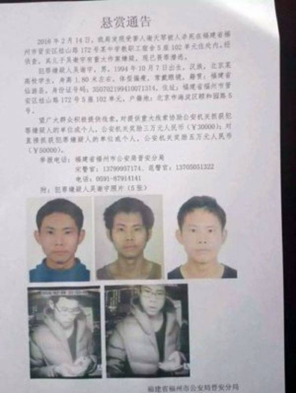 ▲ 2016年福州公安对吴谢宇的悬赏通报(图/网络)