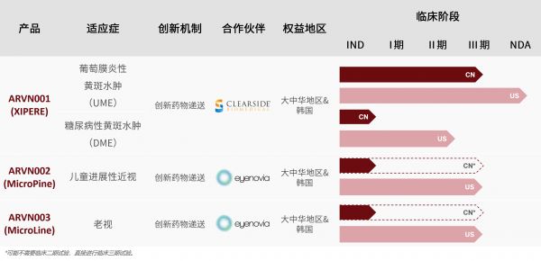 极目生物现有管线包括3款III期临床阶段的引进产品,分别为用于治疗葡萄膜炎性黄斑水肿的ARVN001(锋脉®),用于儿童进展性近视治疗的ARVN002和用于老花眼治疗的ARVN003。