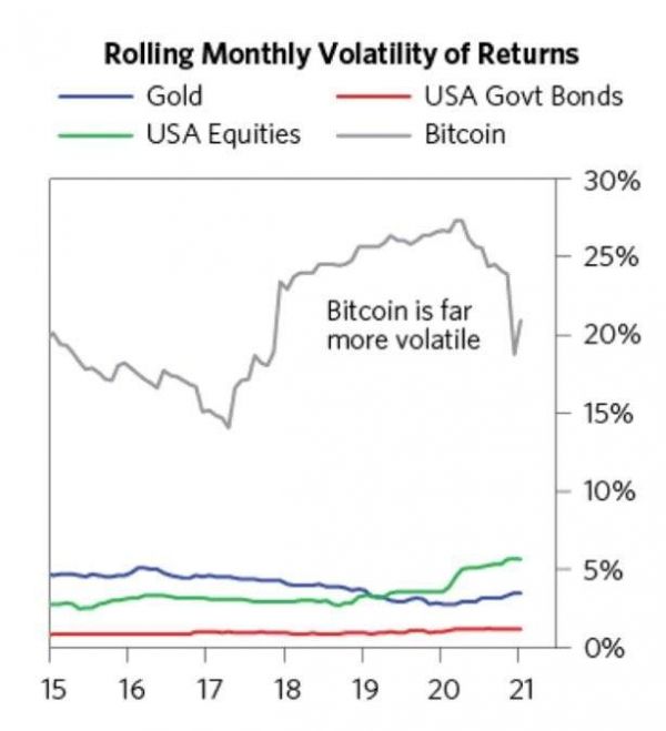 从公司财务管理的角度来看,特斯拉的举动也很少得到其他上市公司的赞同,因为公司资产的稳健保值是公司财务管理的首要考量,传统来看,波动性大的资产几乎从来不会进入作为公司多余现金配置的考量范围。从过往走势表现来看,比特币的波动性远远超过股票、政府债券、黄金等传统资产。