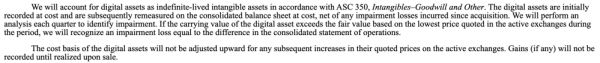 特斯拉也明确说明了以成本法计入的数字资产在未来并不能因其在任何活跃交易所中的交易价格的变化而计入上涨,任何所谓的收益只有在出售时才可以在会计上实现。