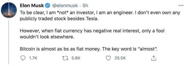 除了特斯拉公司的官方说明之外,特斯拉首席执行官马斯克也对投资比特币做了一定的说明,他在个人推特上表示,“我并不是投资者,我只是一个工程师,我并不持有除特斯拉以外任何的股票。”