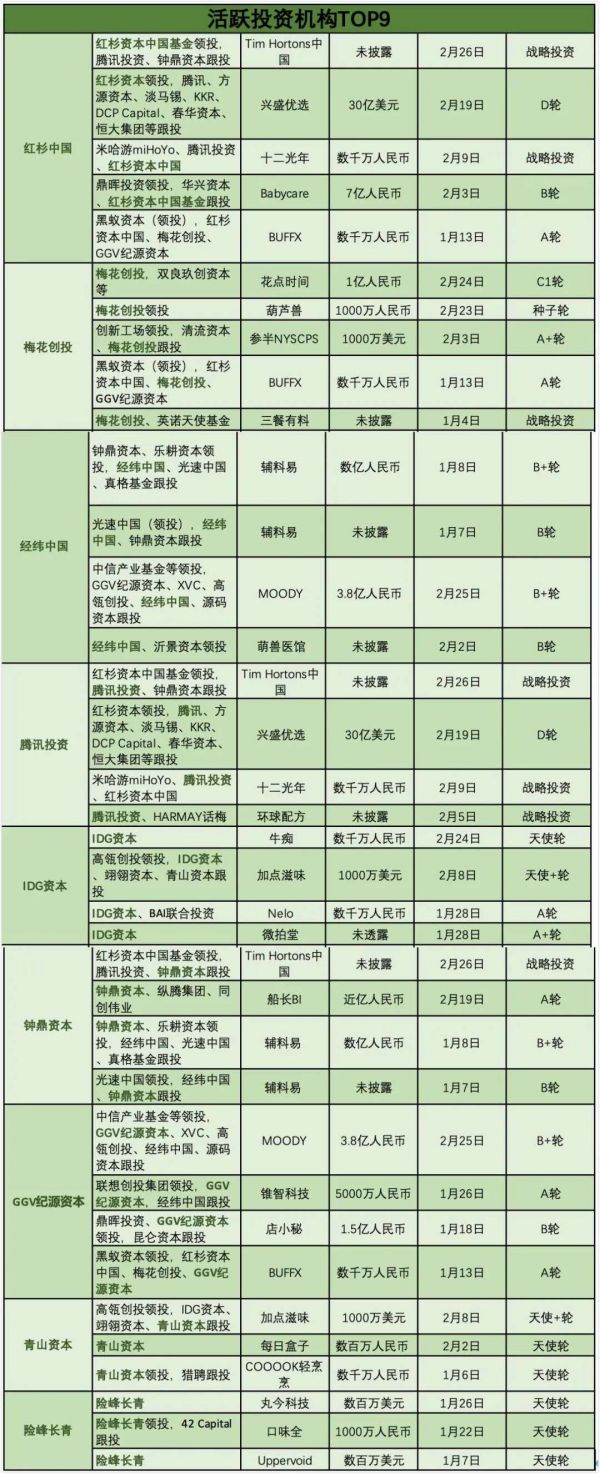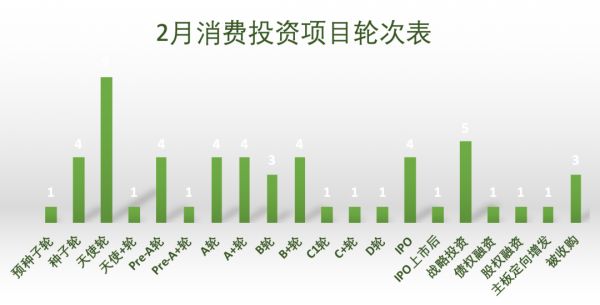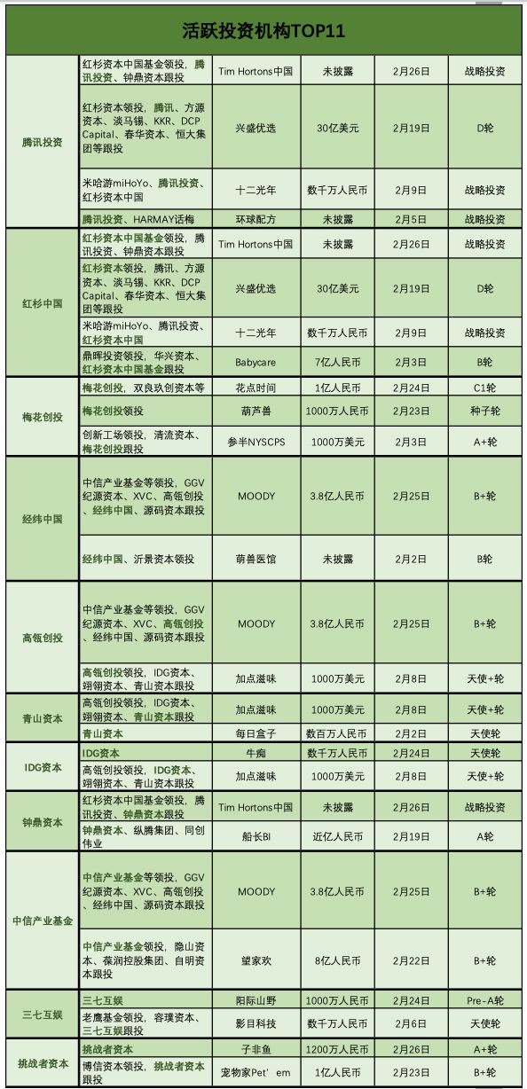 与1月统计方式一致,由于在投资事件中,一般有多家投资方,很难计算具体在每笔中的投资金额,此次排名主要按照出手的频次来判断该投资机构在消费行业的活跃度。如果投资笔数相同,那么则参考所投投轮次、领投或者跟投身份以及该笔总融资额进行估算。