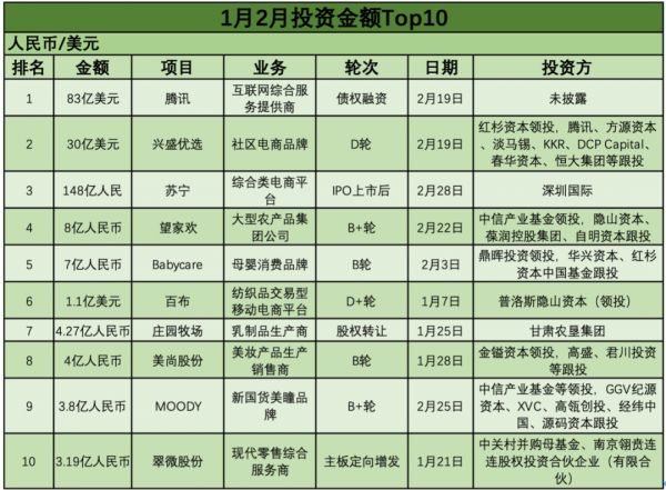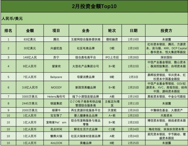 我们看到2月的投融金额比1月相比,数据要更加巨额。姑且不谈腾讯83亿美元的债权融资,社区连锁超市兴盛优选获得高达30亿美元的D轮融资。而1月融资最高的百布仅为1.1亿美元。