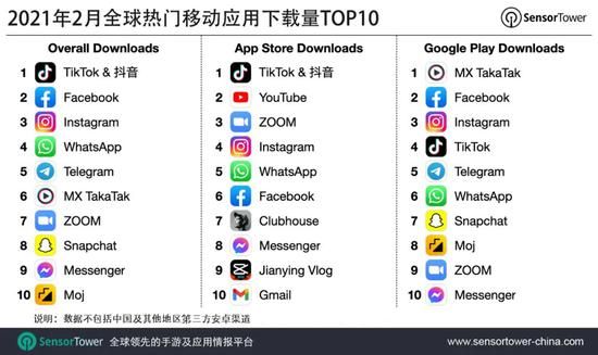 SensorTower:2020年2月全球热门移动应用下载量TOP10