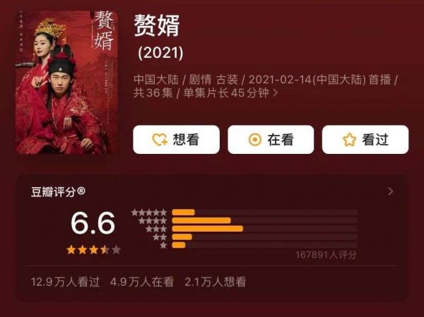 截止到发稿前,《赘婿》的豆瓣评分已经完成了0.5分的回落,从开画7.1分,下跌到了6.6分。且从观众的反馈声来看,6.6分应该并不是终点。