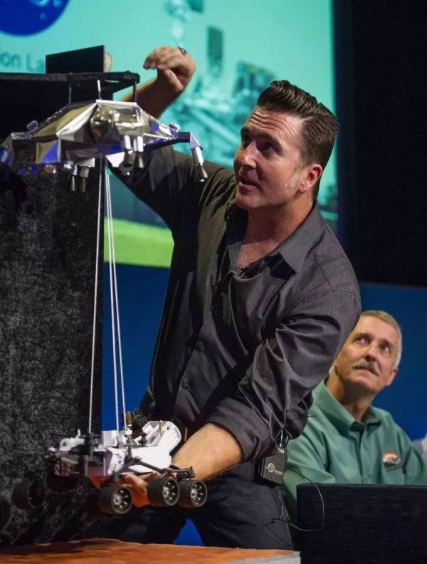 亚当·施特尔茨纳在喷气推进实验室的简报会上演示好奇号的降落方案(来源:Wikimedia)