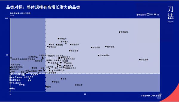 纵观历史之后,我们可以从数据的角度去分析品类机会。下面我们将中国跟美国和日本,进行品类人均支出和市场集中度的对标,筛选了一些我们认为有高增长潜力,和高市场集中度的品类。
