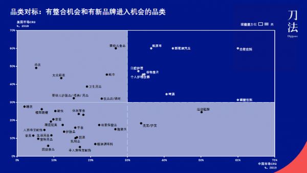 左上角的象限表示,这个行业在美国比较集中,在中国没那么集中,我们认为这些品类有利于现有的头部企业去整合这个市场。