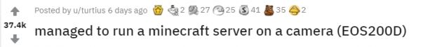 在单反上玩上我的世界后,Turtius把自己的演示视频发到了Reddit上,引来一堆网友围观,如今点赞已经有37.4K,上百人参与了讨论。