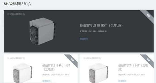 头部矿机厂商比特大陆(生产蚂蚁矿机)的官网显示,相关的比特币矿机皆显示售罄,发货时间延后到了2021年8月。