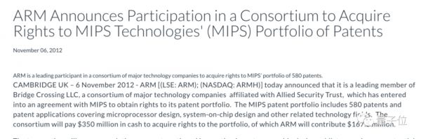 Arm联合自己所属组织Bridge Crossing(专门收购技术专利),以3.5亿美元收购MIPS近500项专利,当中Arm出资1.675亿美元。