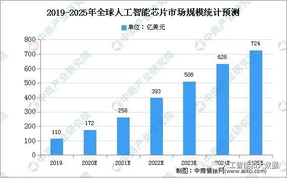 Tractica数据显示,2019年全球人工智能芯片市场规模为110亿美元,中商产业研究院预测2025年全球人工智能芯片市场规模达到724亿美元。