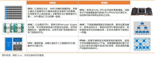 行业发展初期,GPU和CUDA的部署加入使得深度学习和神经网络获得惊人发展,在训练端,由于需要对大量原始数据进行运算处理,要求云端的训练芯片有较好的通用性和可编程能力,GPU成为当仁不让的第一选择。推理端对于硬件性能要求没有训练端高,更注重性能、功耗和成本的平衡。