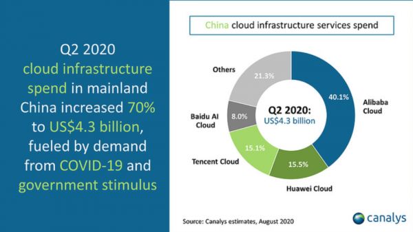根据英国调研机构Canalys发布的2020年第二季度中国基础云市场报告显示,中国云计算市场整体规模达43亿美金,同比增长70%。其中,头部四家厂商市场占有率达78.7%。百度智能云位列第四,与阿里云、腾讯云等位居第一阵营。