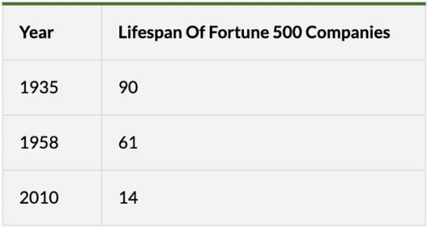 首先,财富500强企业的寿命正在缩短。查尔斯·范恩是麻省理工学院的研究员,也是《时钟速度》的作者,他认为:“行业的时钟速度越快,竞争优势的半衰期就越短。”