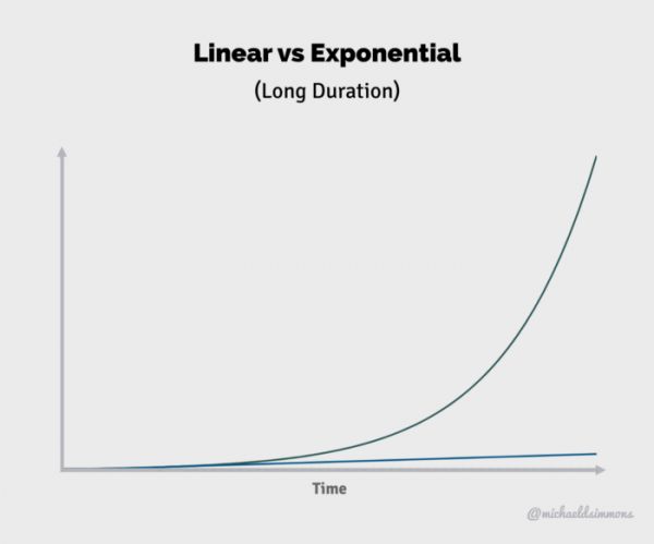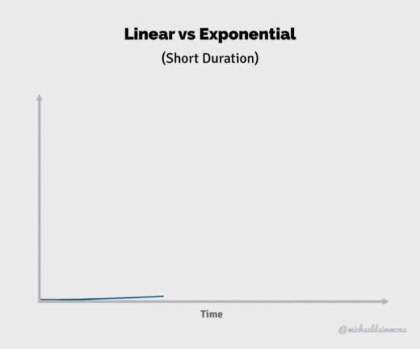 让我们来分析一下。当我们从更长的时间来看线性和指数曲线时,很容易看出两条曲线之间的差异。