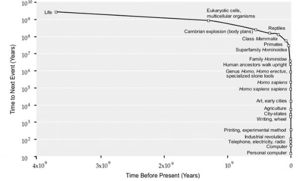 库兹韦尔画出的关键事件大致反映了编纂了最重要历史事件的参考书。当然,因为过去有一种趋势,并不意味着未来会延续下去。但是,在我看来,如果一种趋势已经在地球上存在了10亿年,那么至少它在未来20年发生的可能性是可预测的。