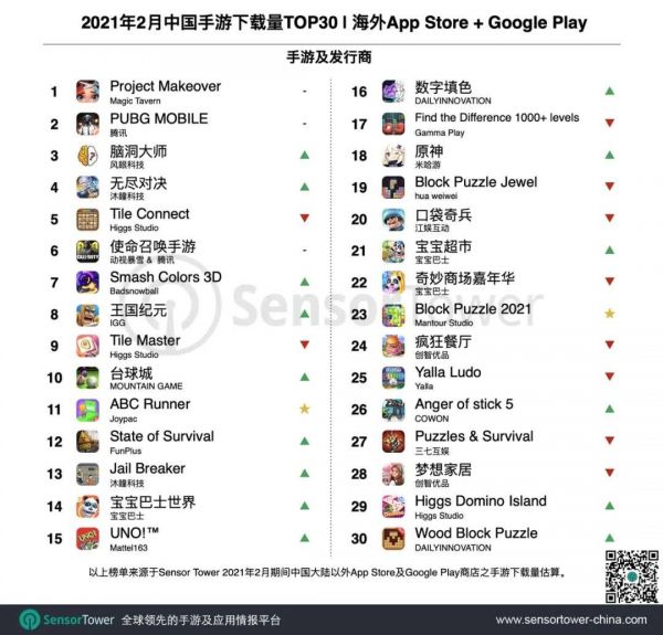 Sensor Tower商店情报平台最新数据显示,2021年2月中国手游产品在海外市场收入及下载量排名TOP30,详细榜单变化如下。