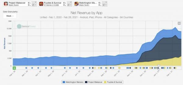 在消除手游赛道,Magic Tavern《Project Makeover》和三七互娱《Puzzles & Survival》排名分别较1月前进1位和5位。随着这两款游戏的加入,中国厂商在海外Puzzle手游的收入占比从2020年2月2.5%,提升至9.2%。过去一年,Puzzle手游在海外市场的收入仅增长了25%,但中国厂商在这一赛道却实现了368%的年增长。
