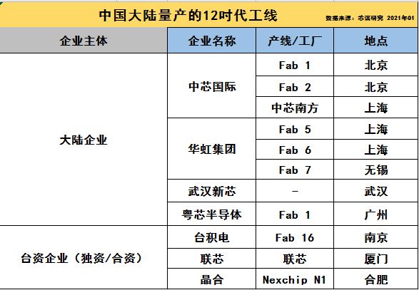 目前中国大陆企业处于量产的12吋代工生产线,只有“中”“华”“粤”“新”这“两大两小”。