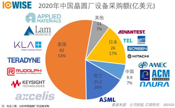 虽然过去几年中国设备产业取得了长足的进步,但至少在当下,中国半导体离不开国际供应链,尤其是产能扩产更需国际设备。据芯谋研究统计中国晶圆厂设备国际采购,仅美国设备占比就达到53%!