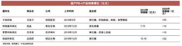 2018年底,君实生物的特瑞普利单抗在国内获批上市,主要用于黑色素瘤的治疗;一个月之后,信达生物的信迪利单抗问世,主要针对经典型霍奇金淋巴瘤的治疗。2019年,恒瑞医药的卡瑞利珠单抗、百济神州的替雷利珠单抗相继上市,当时获批的适应症均为经典型霍奇金淋巴瘤。