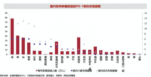 PD-1抑制剂通过调节人体自身的免疫细胞来治疗肿瘤,具有广谱抗癌的特性。同一款PD-1产品,往往可以应用于十余种癌症的治疗,因此其被称为“肿瘤神药”,很长时间里都是医药研发热点。