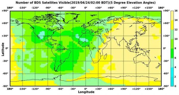 2019年4月24日,北斗卫星的全球可视数量分布图,大于4即可提供定位授时服务,北斗已经基本“点亮“全球(图片来源:北斗办)