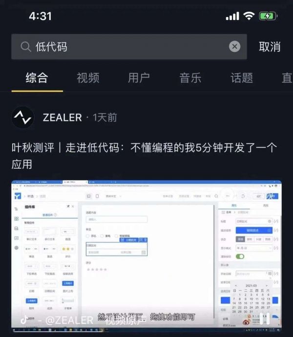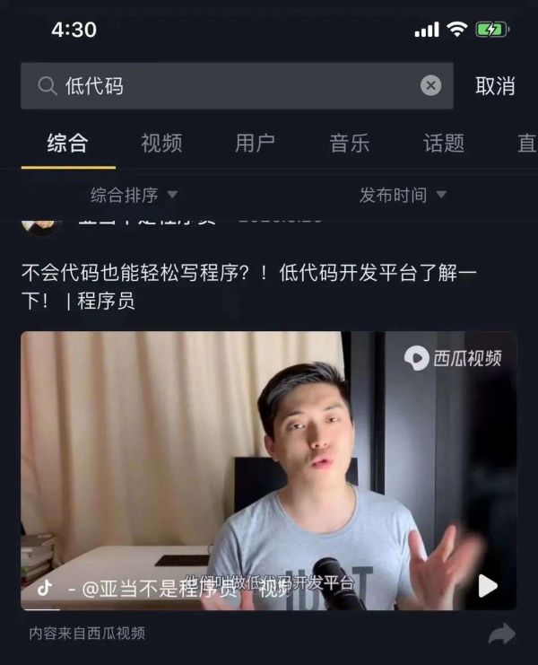 比如你在抖音搜索“低代码”关键词,搜索出来的短视频是两种:一种是该领域的用户谈它的创业经历与点子,然后再回到低代码的解读,虽然进入主题的时间过长,但也算相对通俗易懂的讲明白了这个概念,对于许多小白用户来说,也偏好这种口语化的讲解。