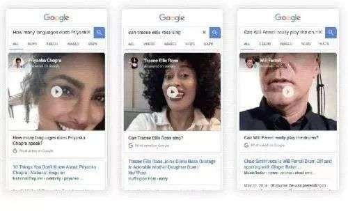 此外,Google搜索结果还引入了名人视频问答,显然谷歌在这里要打的是社交牌,即当用户搜索一个问题时,视频答案将显示在搜索结果的顶部,不过当用户在观看第一个视频后,转盘会自动切换到名人系列问答中的下一个,用户可以选择观看名人回答也可以略过。