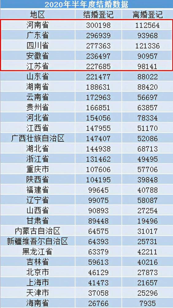而根据《2020年上半年中国各省份离结率名单》显示,结婚难不再仅仅是一线白领的“专利”,而是全国性普遍性的问题。