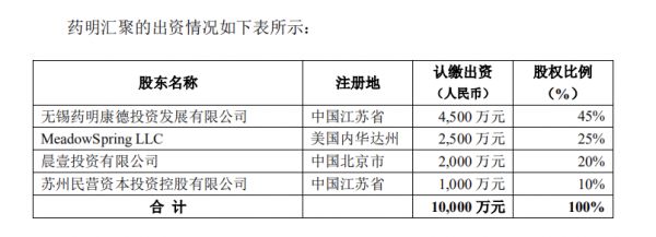 第一步:药明康德全资子公司药明投资拟与 MeadowSpring、晨壹投资有限公司、苏州民营资本投资控股有限公司共同出资设立药明汇聚,注册资本为人民币1亿元,其中本公司拟认缴出资人民币 4,500 万元。