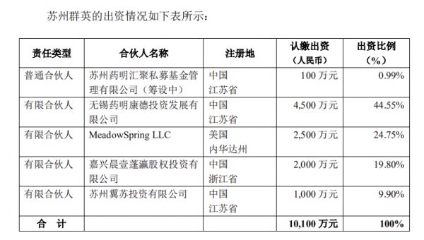 第二步:待药明汇聚设立后,药明投资、MeadowSpring、晨壹投资有限公司的全资子公司嘉兴晨壹蓬瀛股权投资有限公司、苏州民营资本投资控股有限公司的全资子公司苏州翼苏投资有限公司拟作为LP,药明汇聚作为GP共同出资设立苏州群英,注册资本为人民币 1.01 亿元,其中本公司拟作为有限合伙人认缴出资人民币 4,500 万元,占苏州群英 44.55%的出资比例。