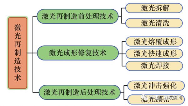 激光再制造技术可用于激光再制造的前处理、成形修复和后处理环节,具体分类如图1所示。其中,核心环节是激光成形修复技术,如采用激光熔覆成形、激光快速成形以及激光焊接工艺来修复零件缺损部位。此外,激光切割和激光清洗技术可用于零件的拆解和前处理环节,激光冲击强化和激光抛光可用于零件修复件的后处理环节。