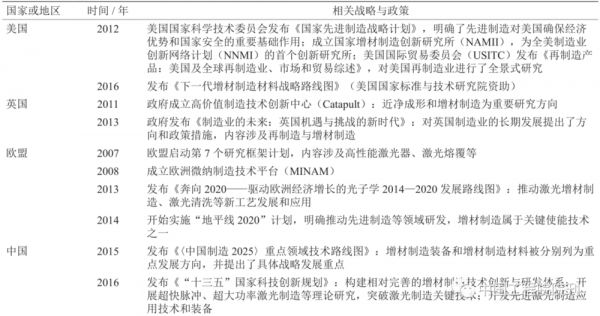 表1 世界主要国家或地区激光再制造技术及产业相关战略与政策
