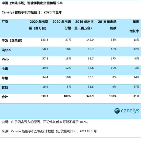 并不是完全的顺风,小米OV还面临着苹果这一强大的对手——iPhone 12 系列将掀起换机、升级的超级周期,2020年在中国市场出货量同比大涨14%,是中国市场增长最多的品牌。