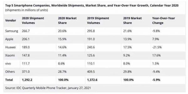 2020 年 Q4,IDC 报告显示,华为以 3230 万台的出货量和 8.4% 的市场份额排名降至第五,同比下滑 42.4%,成为唯一下滑的智能手机厂商。在另外两家研究机构的榜单中,华为甚至跌出了前五,这是近六年来的最差成绩。