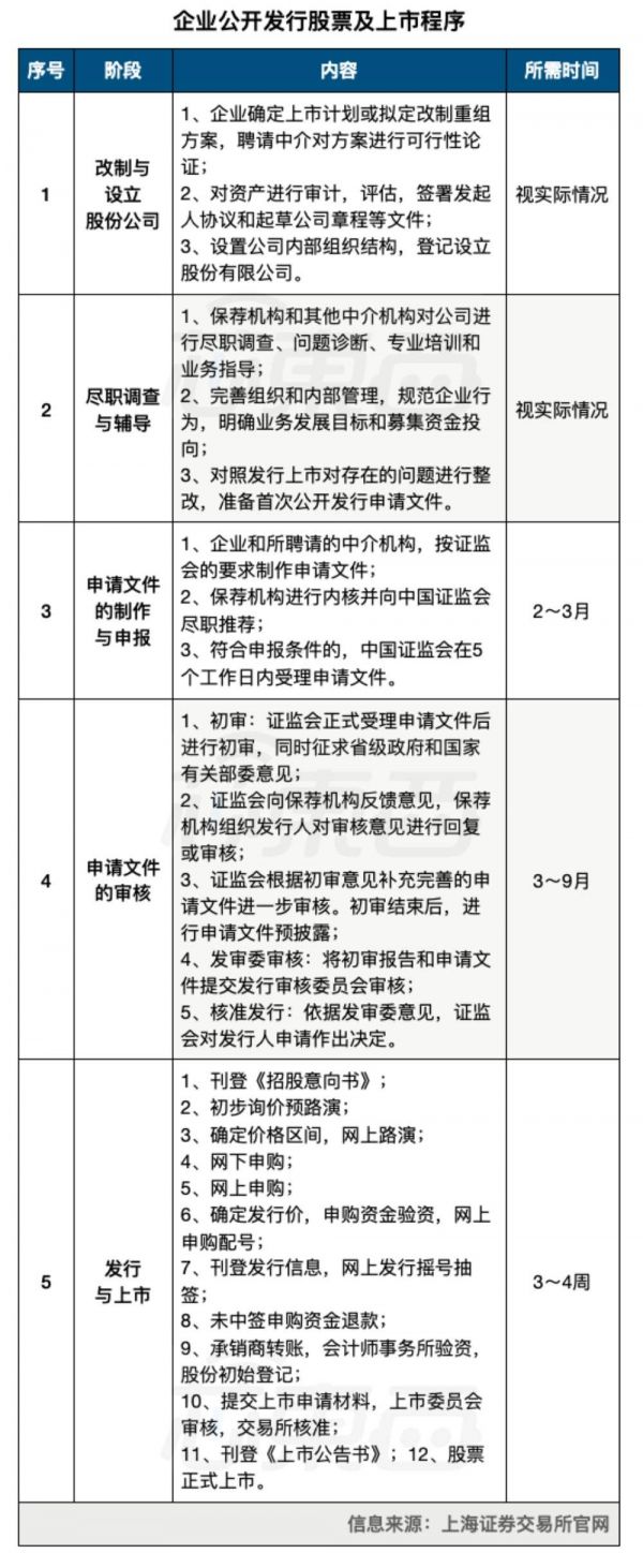 1、改制与设立股份公司;2、尽职调查与辅导;3、申请文件的制作与申报;4、申请文件的审核;5、发行与上市。