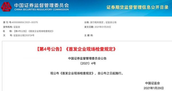 去年10月,证监会发布了《首发企业现场检查规定(征求意见稿)》;今年1月29日,证监会正式下发了《首发企业现场检查规定》(简称《检查规定》)。