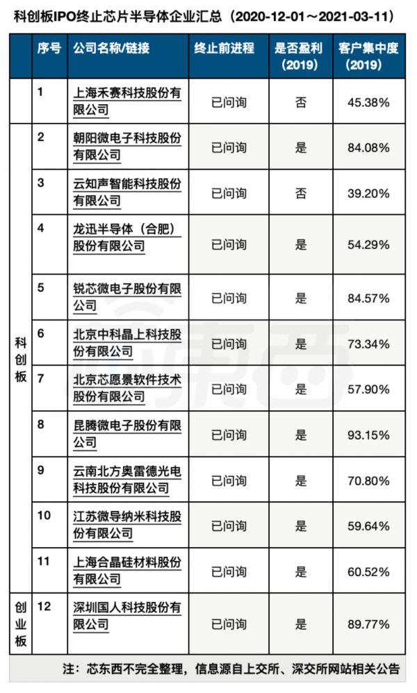 芯东西梳理主动申请终止IPO 12家芯片企业的招股书,发现朝阳微电子、锐芯微、昆腾微、国人科技的客户集中度均高于80%,云知声尚未实现盈利等。
