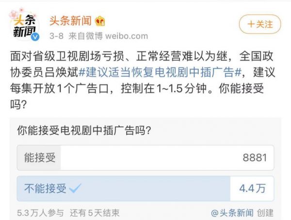 两会期间,《关于适当恢复电视剧中插广告的提案》引发全民关注。目前相关微博话题已有1.6万的讨论量。在头条新闻官方微博发布的投票中,参与的5.3万人里,有超过83%的人选择“不能接受”。