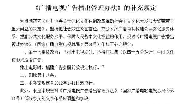 2011年底,对电视剧广告的限制力度再次加大。广电总局颁布的《〈广播电视广告播出管理办法〉的补充规定》中,要求自2012年起,所有电视剧中间不得以任何形式插入广告。