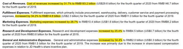 分拆成本结构可以看到,2020年的第四个季度,营销成本增长26.7%,研发成本增长25.4%,并没有超过收入的增幅。真正成本增长的来自履约费用和管理费用,各增长了34.2%和34.4%,正好都超过了收入增加的幅度。