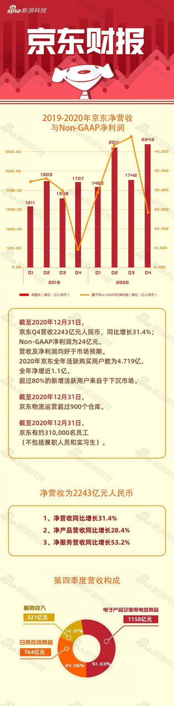 @新浪科技【京东第四季度净利润24亿元,同比增长200%】京东发布了截至12月31日的2020年第四季度及全年财报。第四季度,京东净营收为2243亿元人民币(约合344美元),同比增长31.4%。归属于普通股股东的净利润为243亿元(约合37亿美元),而上年同期净利润为人民币36亿元。基于非美国通用会计准则,归属于普通股股东的净利润为人民币24亿元(约合4亿美元),而上年同期净利润为人民币8亿元。整个2020年,京东净营收为7458亿元人民币(约合1143美元),较2019年增长29.3%。