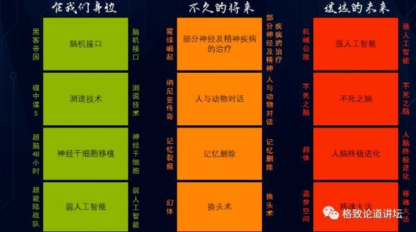 这里分了三大类:一是在我们身边已经成为现实的脑科学,一类是在不久的将来可能变成现实的脑科学,还有一类是在遥远的未来才有可能实现的。