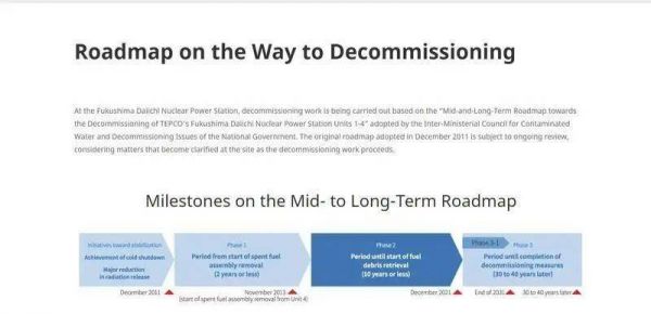 2011年12月,东电联合日本经济产业省首次制定了《福岛第一核电站1-4号机组拆除的中长期路线图》,拆除进程在日本经济产业省和东电的官网上进行每月更新,并受到NRA监管。一旦出现问题,NRA有权让东电停下并进行整改。