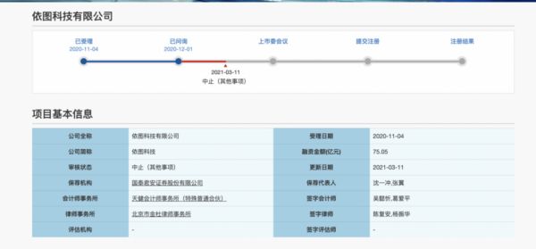 昨晚(3月11日),上交所披露,依图科技有限公司因发行人及保荐人主动要求中止审核,上交所决定中止其发行上市审核。