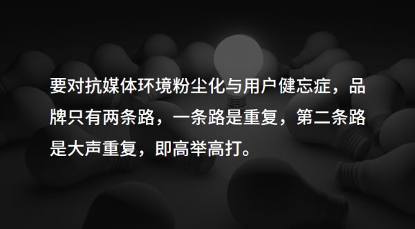 要对抗媒体环境粉尘化与用户健忘症,品牌只有两条路,一条路是重复,第二条路是大声重复,即高举高打。华与华咨询创始人华杉认为,宣传的本质在于重复,受众的本质在于遗忘,品牌要通过重复对抗遗忘。诺贝尔经济学奖获得者康纳曼则认为要使人们相信一个概念或事物的方法就是不断重复。