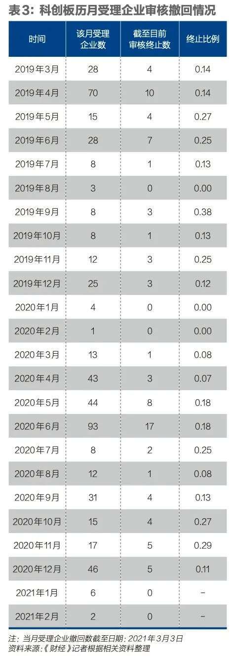 《财经》记者根据上交所官网梳理,科创板2019年共计受理企业205家,已终止36家,审核淘汰比例为18%;2020年共受理企业327家,截至3月3日已终止审核50家,审核淘汰比例为15%,不过因未审核完毕,该数字还在进一步增多。