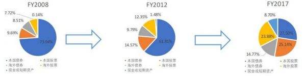 比较2008FY、2012FY、2017FY的投资组合,可以看到GPIF对于海外权益市场的投资比例在逐步上升,对于海外债券市场的投资比例也同样处于上行趋势,显示出GPIF在海外市场的布局逐步深入;